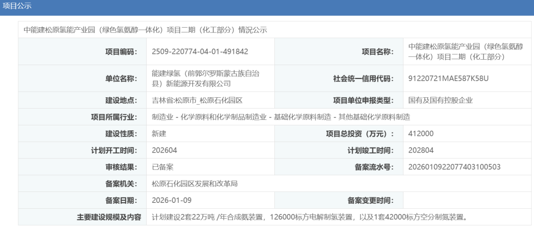 近日,中能建松原氢能产业园(绿色氢氨醇一体化)项目二期(化工部分)获备案。