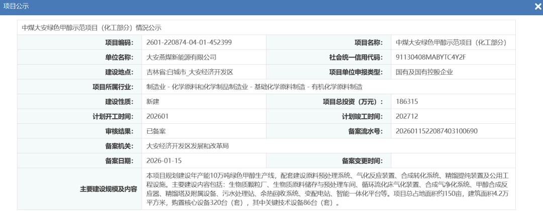 近日,中煤大安绿色甲醇示范项目(化工部分)情況获备案。