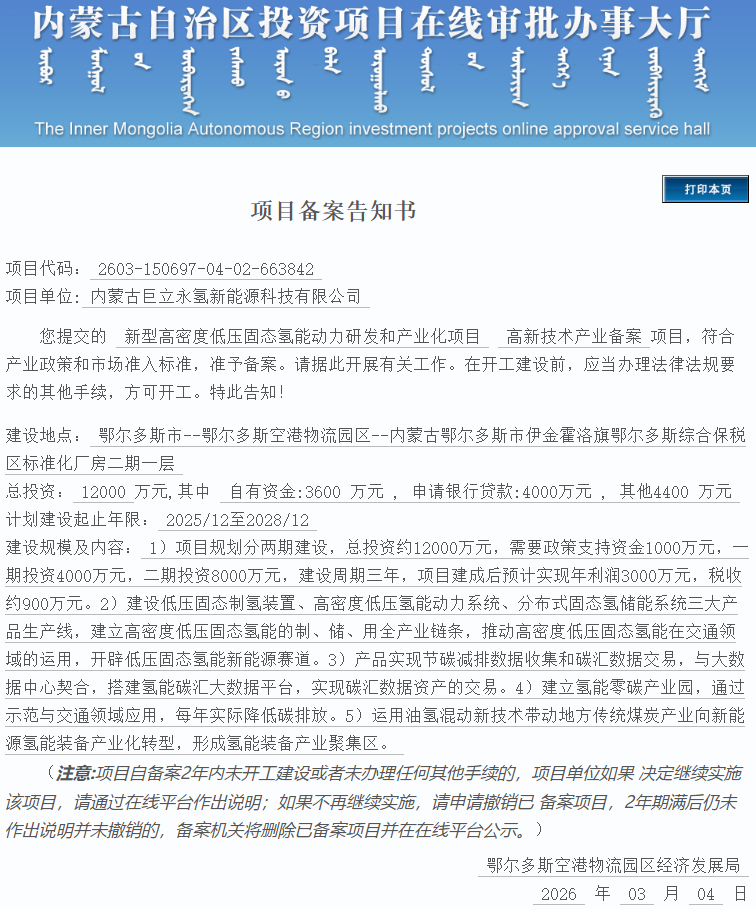 近日,新型高密度低压固态氢能动力研发和产业化项目获备案。
