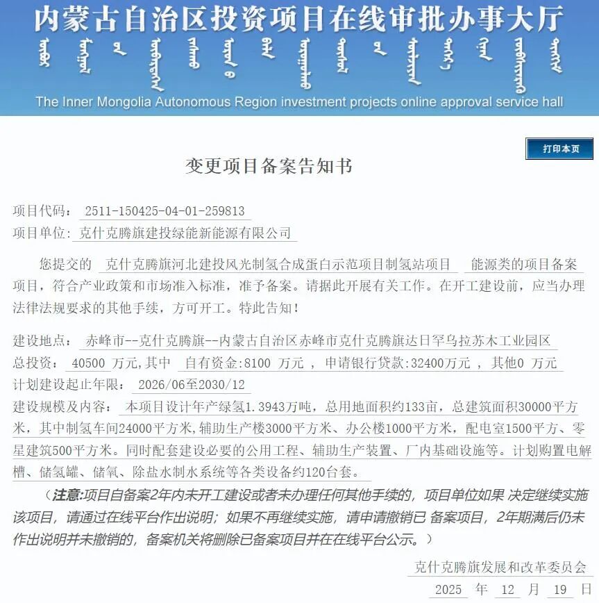 近日,克什克腾旗河北建投风光制氢合成蛋白示范项目制氢站项目变更获批。