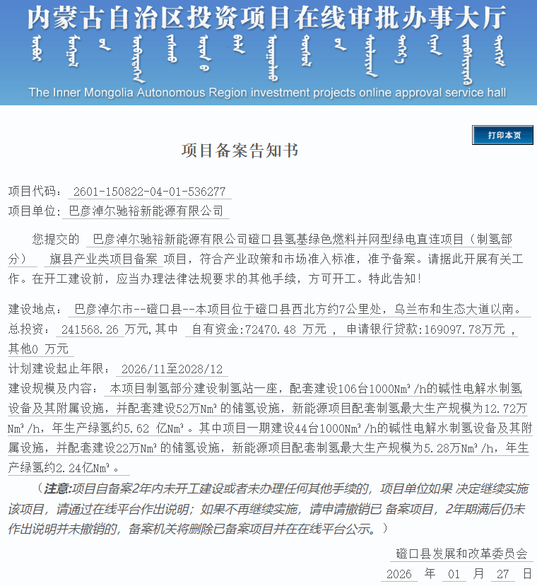 2026年1月27日,巴彦淖尔驰裕新能源有限公司磴口县氢基绿色燃料并网型绿电直连项目(制氢部分)获备案。