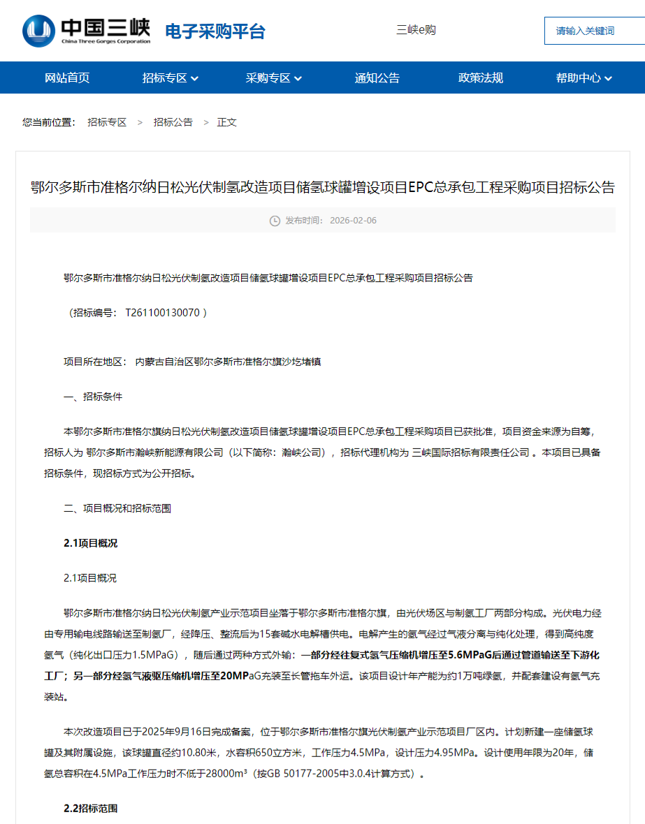 2026年2月6日,中国三峡电子采购平台发布《鄂尔多斯市准格尔纳日松光伏制氢改造项目储氢球罐增设项目EPC总承包工程采购项目招标公告》,招标人为鄂尔多斯市瀚峡新能源有限公司。