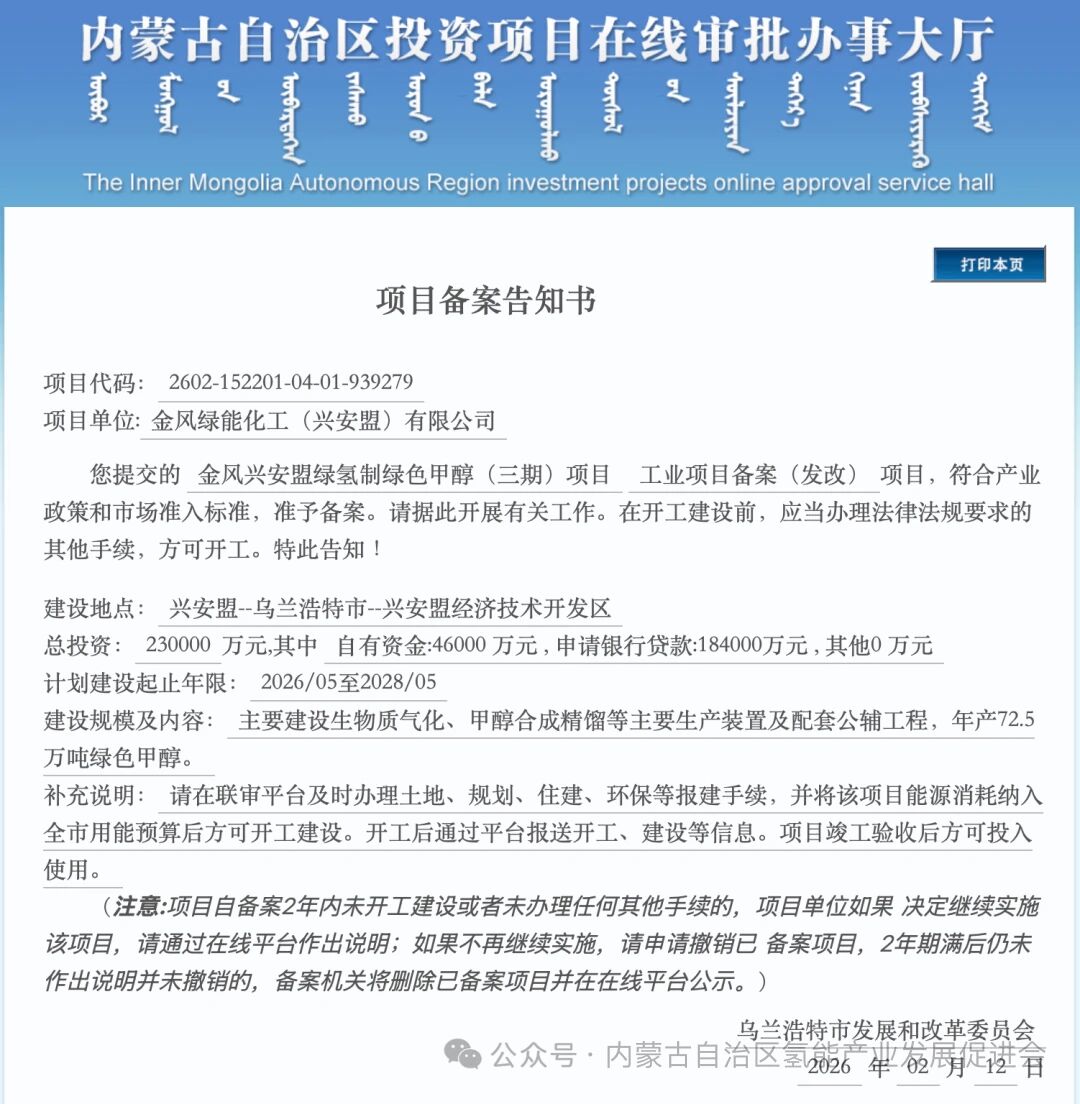 2026年2月12日,金风兴安盟绿氢制绿色甲醇(三期)项目获备案。