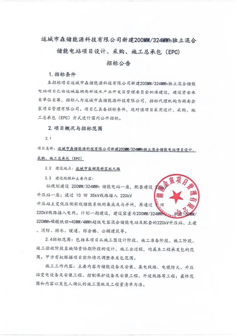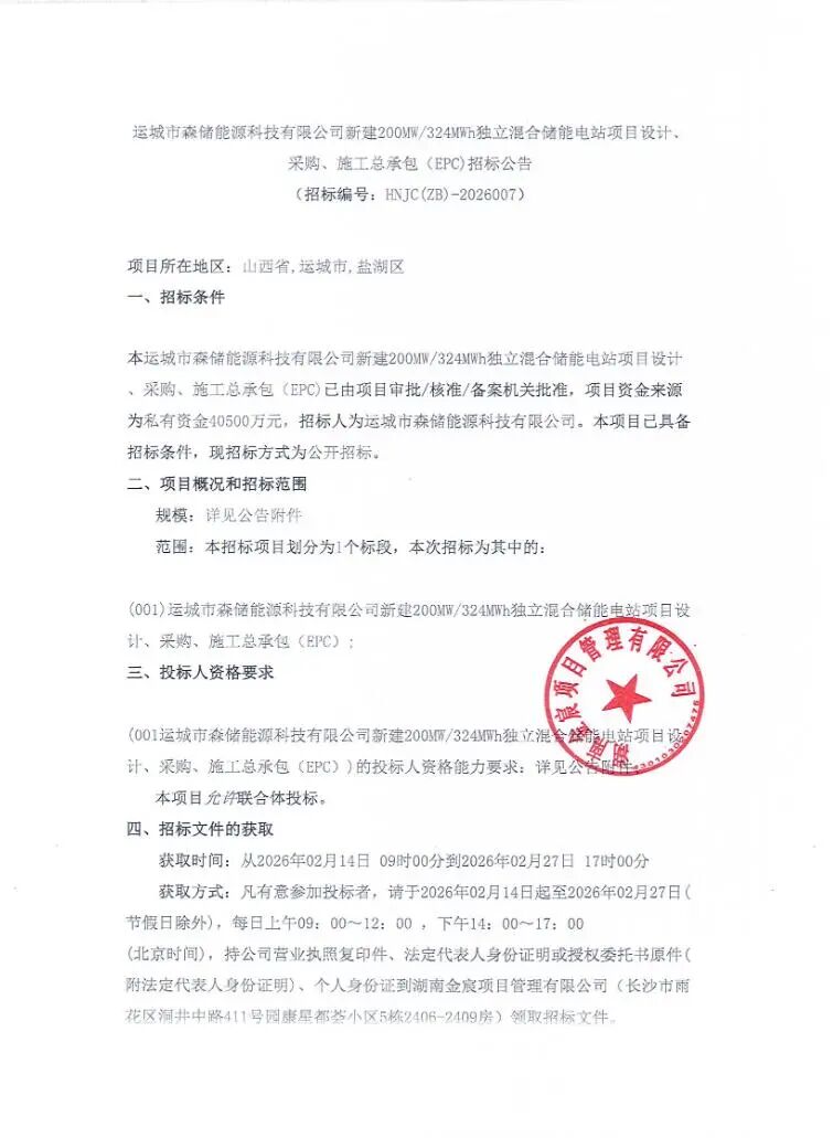 2026年2月13日,运城市森储能源科技有限公司山西省新建200MW/324MWh独立混合储能电站项目EPC招标公告发布,项目建设地点为山西省运城市盐湖高新区纵九路。