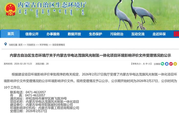 2026年2月28日,内蒙古自治区生态环境厅官网发布内蒙古自治区生态环境厅关于内蒙古华电达茂旗风光制氢一体化项目环境影响评价文件受理情况的公示。