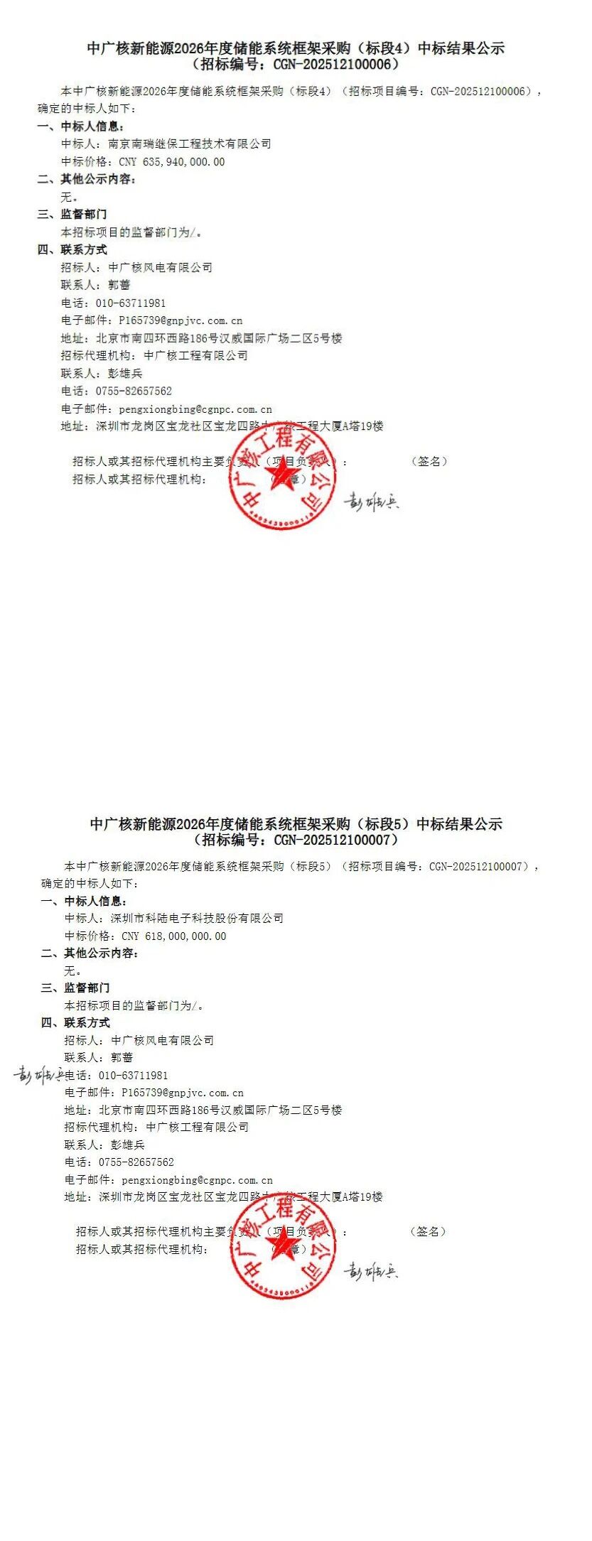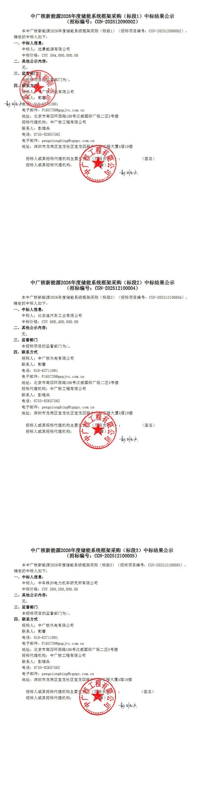 2026年3月25日,中广核新能源2026年度储能系统框架采购结果公示。