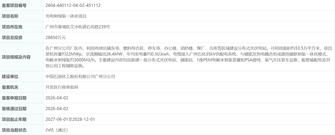 2026年4月2日,中石化广州光电制绿氢一体化项目获批: