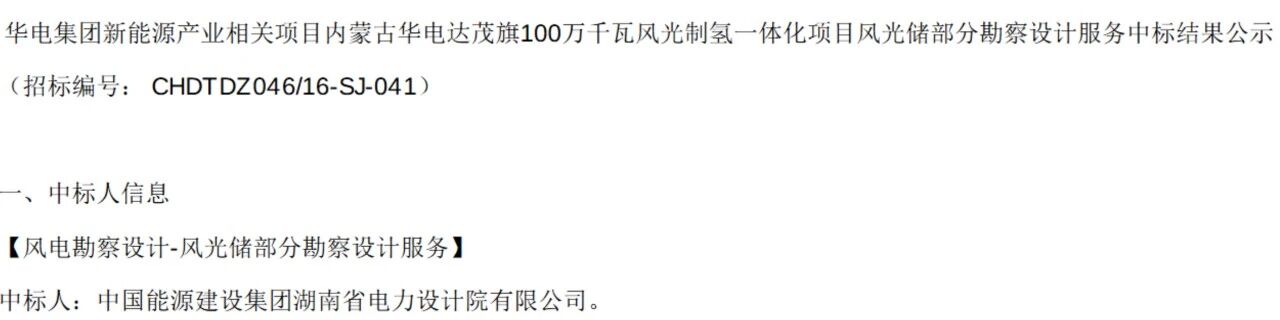 2026年4月1日,内蒙古华电达茂旗100万千瓦风光制氢一体化项目风光储部分勘察设计服务中标结果正式公示,中国能源建设集团湖南省电力设计院有限公司成功中标。该项目由内蒙古华电华阳氢能科技有限公司负责建设,其中华电股份占股98%,明阳智能占股2%。