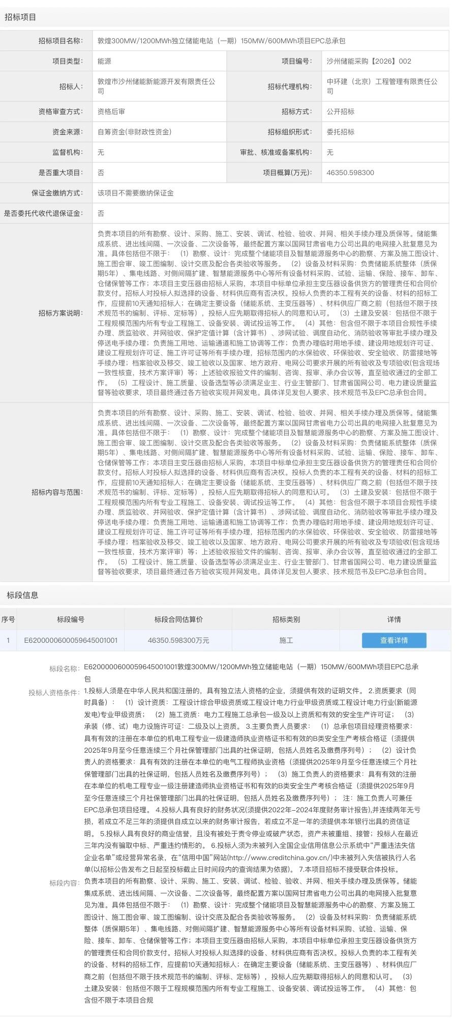 近日,敦煌300MW/1200MWh独立储能电站(一期)150MW/600MWh项目EPC总承包中标候选人公示正式发布。