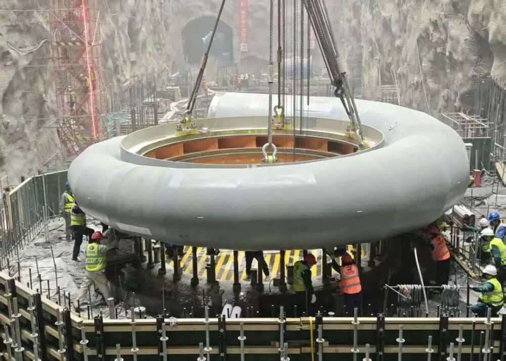 6. 首台机组蜗壳座环吊装成功(2026年4月16日) :重达134.8吨、最大外径10.884米的蜗壳座环在地下厂房内顺利完成吊装,标志着电站机电安装工程迈出关键一步。目前项目总体工程进度已过半,正全力冲刺1号引水系统全线贯通、上下水库混凝土面板浇筑等关键节点,预计 2028年建成投产。